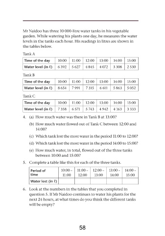 levels in the tanks each hour. His readings in litres are shown in